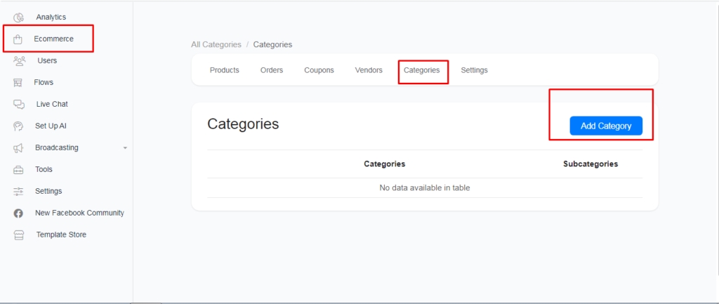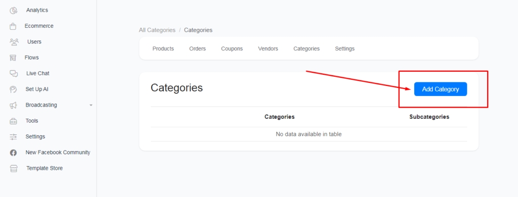 Now to create a new category, click the “Add Category” button above the table.