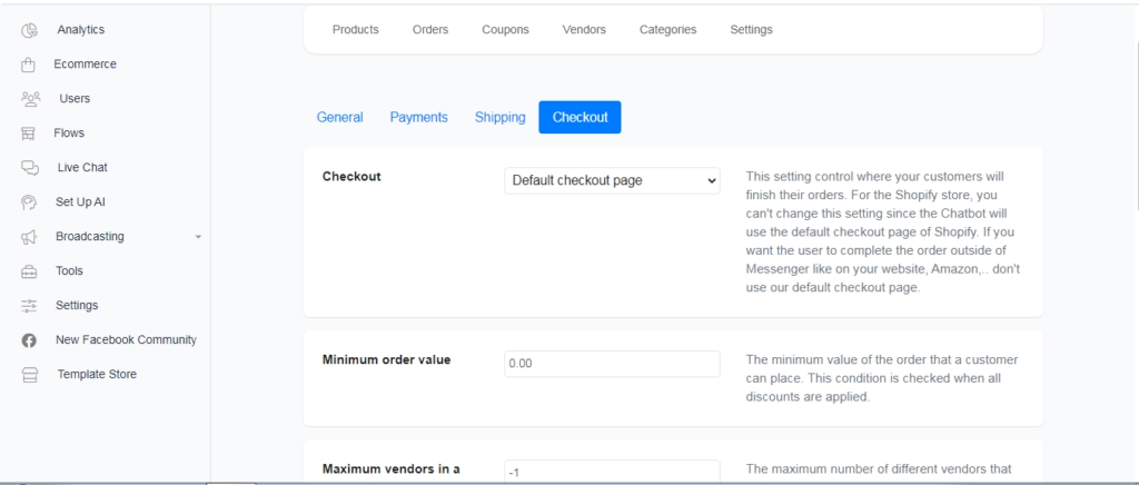 Checkout – This setting controls where your customers will finish their orders. For the Shopify store, you can’t change this setting since the Chatbot will use the default checkout page of Shopify. If you want the user to complete the other outside of Messenger like on your website, Amazon.. don’t use Fliqr default checkout page.