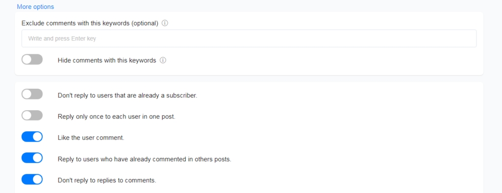 If you do not want your Facebook comment automation to work on comments with specific keywords, define the keywords, and your Facebook automation will not work on comments containing these keywords.