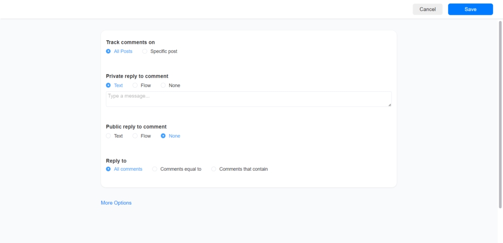 Private Reply to comment – This is the message that will be sent to the user on Messenger. You can reply with a flow, product, plain text, events, elections, news, and vendors.
